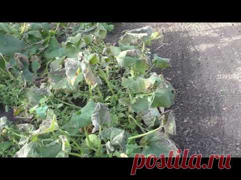 Это изображение показывает растение с поврежденными и увядшими листьями, растущее в саду или огороде. Видна земля вокруг растения.