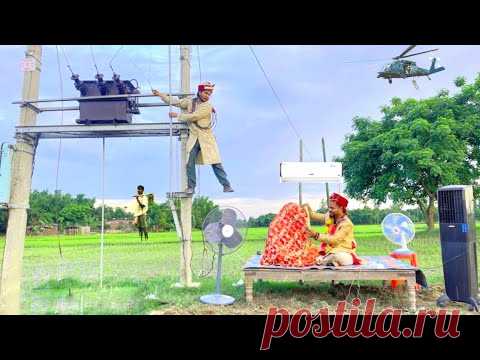 На изображении мужчины в униформе работают на электрических проводах на улице. Один мужчина сидит на деревянной платформе, накрытой цветным тканью, рядом с вентиляторами, а другой пытается взбираться на столб с электрическими проводами. Вдали видны деревья и вертолет в небе.