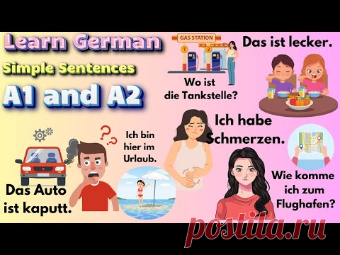 Изображение содержит различные простые предложения на немецком языке, которые можно использовать на уровнях A1 и A2. На нём изображены ситуации и фразы, такие как поиск заправки, вкусная еда, боль в животе, сломанная машина, отдых в отпуске и вопрос о направлении к аэропорту.