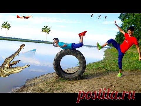 На изображении показано два человека, выполняющих развлечения и трюки с большой покрышкой возле водоема. Один человек лежит на покрышке, а другой стоит позади него, поднимая ногу. На переднем плане изображены крокодил и самолет, летящий в небе. Также на заднем плане видны пальмы и летящие птицы.