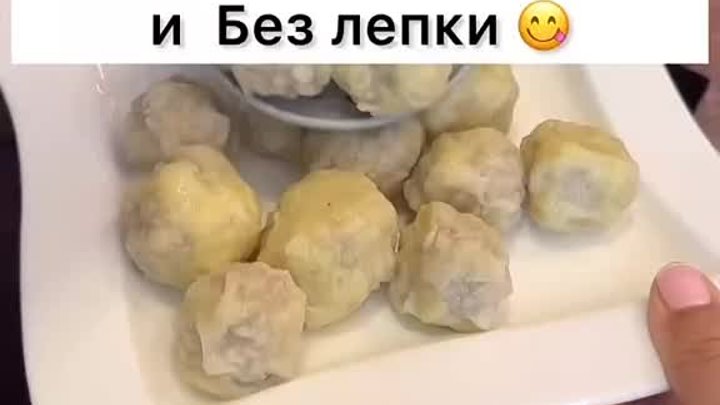 На изображении представлены приготовленные фрикадельки или пельмени на белой тарелке. Сверху изображение сопровождается текстом "и Без лепки" и смайликом.