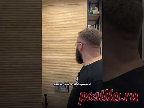 Мужчина с бородой и очками стоит спиной. На заднем плане деревянная панель и полка с предметами. Внизу текст на русском языке: "У нас есть визитная карточка".