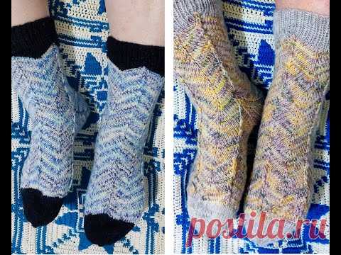 На изображении показаны две пары вязаных носков с различными узорами. Левая пара носков имеет сине-черный цвет с зигзагообразным узором. Правая пара носков имеет серо-желтый цвет с похожим зигзагообразным узором. Носки одеты на ноги, которые стоят на коврике с синим узором.