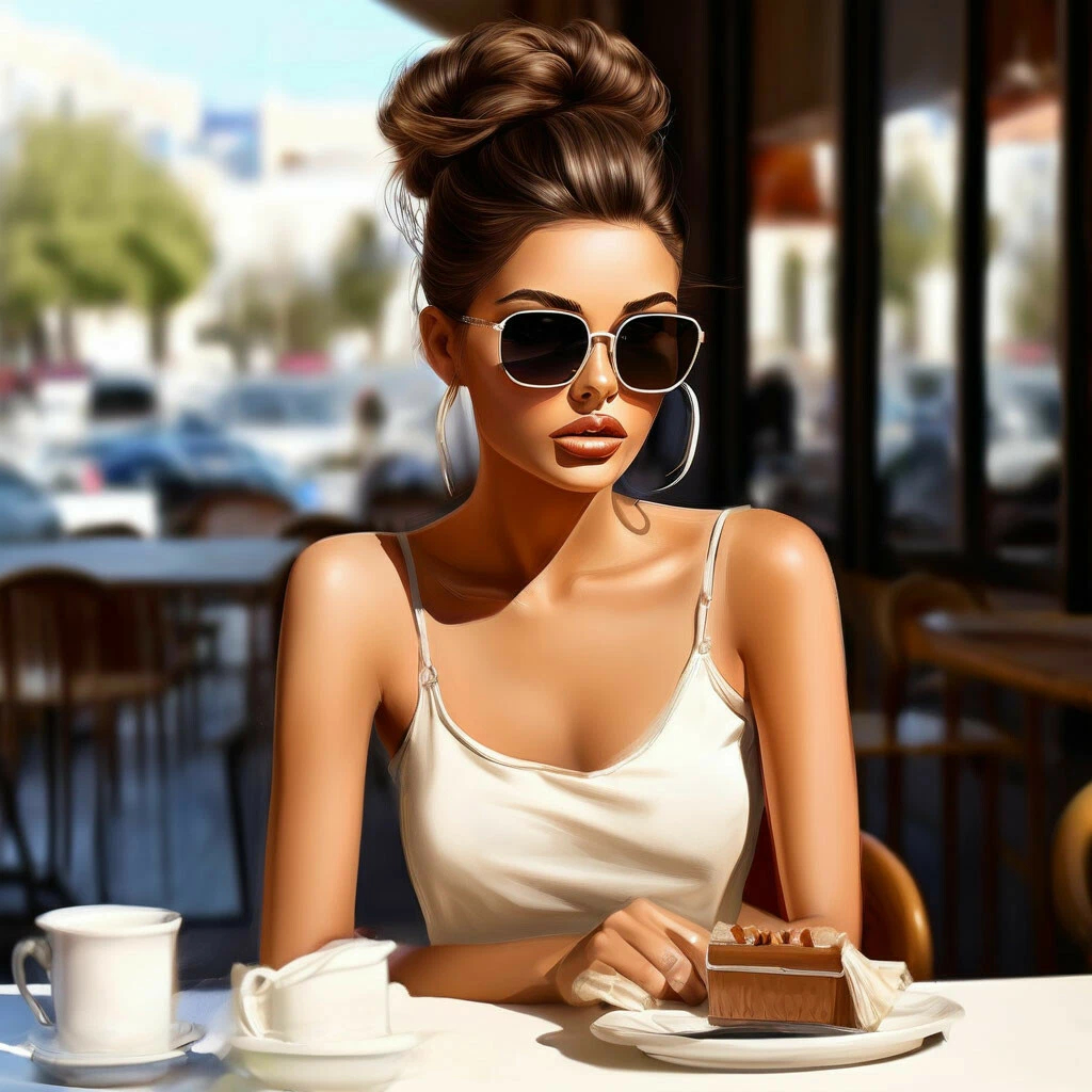 Женщина в солнцезащитных очках сидит в кафе за столиком с чашкой кофе и кусочком торта.