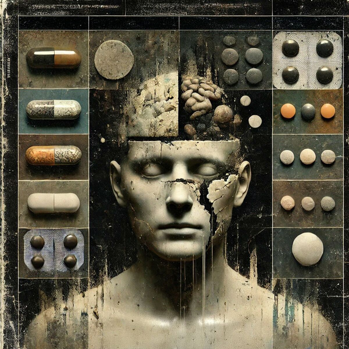 Изображение представляет собой сюрреалистичное сочетание человеческого бюста с открытым черепом, внутри которого виден мозг и разнообразные пилюли или таблетки, расположенные вокруг.