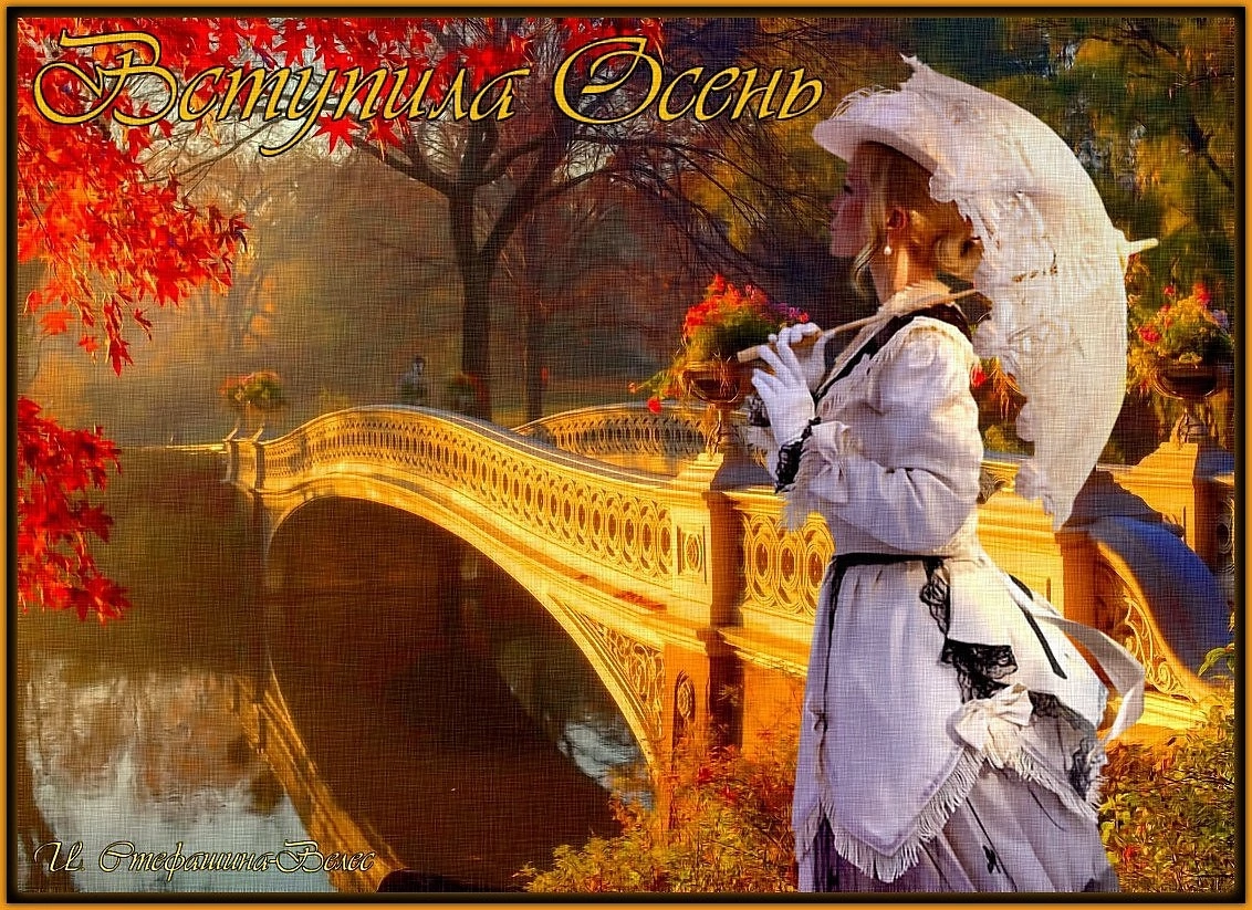 На изображении женщина с зонтиком в старинной одежде стоит у декоративного моста в осеннем парке. Листья деревьев окрашены в яркие осенние цвета.