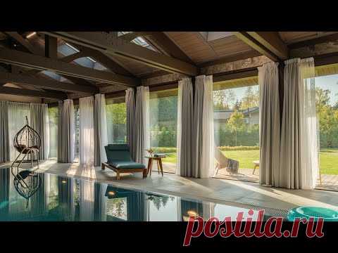 Изображение показывает современный интерьер с крытым бассейном и большими окнами, через которые видно зеленый двор. Рядом с бассейном расположены шезлонг и кресло-кокон.