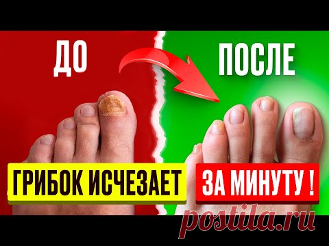 Изображение показывает ступни ног до и после лечения грибка ногтей. Левая сторона с красным фоном показывает ногти с грибком, а правая сторона с зелёным фоном — здоровые ногти. Надписи гласят: "До", "После", "Грибок исчезает", "За минуту!".