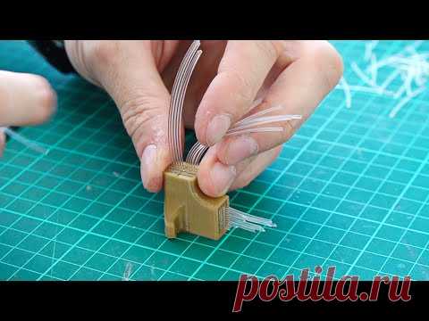 Фото показывает руки, которые работают с небольшим устройством с торчащими пластиковыми прутьями. Устройство находится на зелёной решетчатой поверхности.
