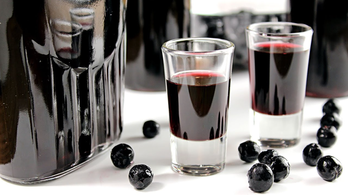 На изображении два стакана с тёмным напитком, который может быть ягодным ликером. Вокруг расположены черные ягоды и большая бутылка с аналогичным напитком.