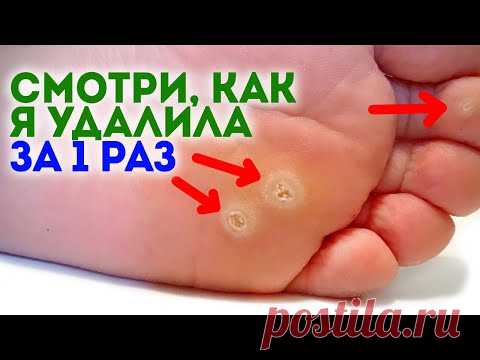 Изображение показывает стопу с мозолями или бородавками и текст на русском языке: "Смотри, как я удалила за 1 раз".