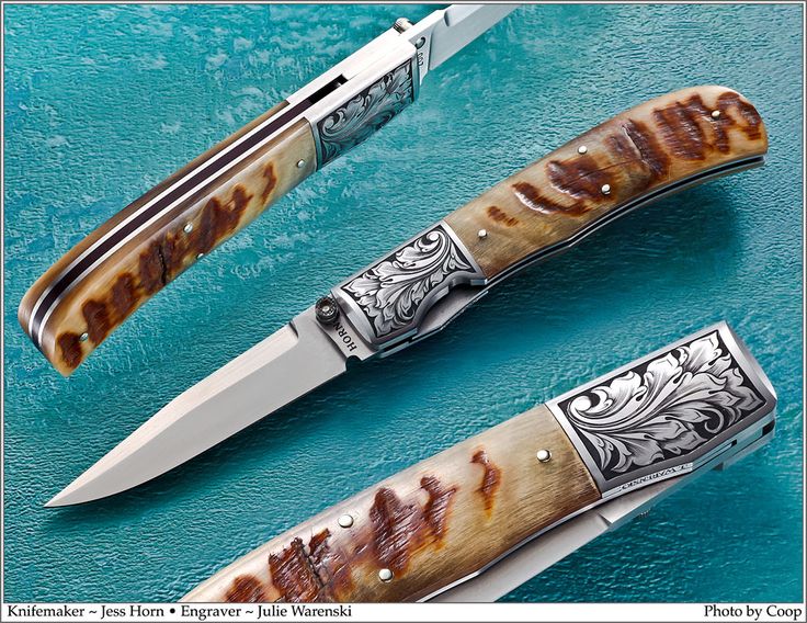 Нож складной от Jess Horn. Гравировка от Julie Warenski. Гравировка. Растительный орнамент. Рог.