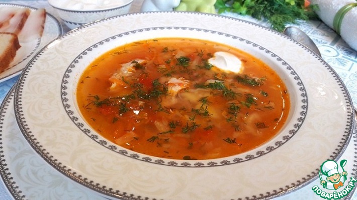- Варим куриный бульон из любых частей курицы. Я обычно, когда разделываю курицу, оставляю хребет. Из него и варю бульон. Можно также добавить и другие кусочки - бедро, крылышко и т. д. Это уже по вашему желанию. Добавить перец горошком, лавровый лист и чуть-чуть соли. У каждой хозяйки есть свой способ приготовления бульона. Варите так, как вам нравится! Пока варится бульон, займемся овощами. Картофель очистить и разрезать на 4 части. Капусту мелко нашинковать. Лук репчатый мелко нарезать. Морковь натереть на крупной терке. Помидоры мелко нарезать. Делаем заправку. Обжарить на сковороде лук и морковь с добавлением растительного масла. Добавить нарезанные помидоры, томатную пасту, 2-3 ст. л. бульона. Потушить чуть-чуть. Можно добавить ещё нарезанного болгарского перца (у меня его не было в наличии). Выдавить чесночок. Ах, какой аромат!!! Убрать с огня. Бульон наш готов! Необходимо процедить. Я всегда так делаю. Бульон получается очень красивый! В готовый бульон кладем картофель, варим до готовности. Затем картофель вынимаем из кастрюли. И толчем его в пюре, но не сильно! Оставляем кусочки картофеля слегка размятыми. В бульон добавляем пшеничную крупу, предварительно я её промыла под проточной водой. И варим до готовности. Когда крупа будем готова, "собираем" наш супчик. В кастрюлю кладем капусту. Затем возвращаем картофель, кусочки курицы и заправку. Перемешать, довести до кипения. Попробуйте на вкус. Может надо добавить ещё соли. Нарезать зелень укропа и петрушки. Добавить зелень в суп. Я ещё добавила свежемолотого разноцветного перца. Выключить плиту. Закрыть кастрюлю крышкой и дать настояться минут 10-15. Капуста у меня молодая, поэтому я её не варю долго. Она очень нежная. Если вы используете старую капусту, тогда необходимо немного её проварить. А потом уже добавлять картошку, заправку и т. д. Наш суп готов!!! Необыкновенный аромат!!! Подаем со сметаной. Буду очень рада, если кто-нибудь из Поварят воспользуется рецептом!