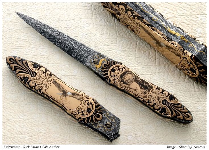 Нож складной от Rick Eaton. Дамасская сталь. Гравировка. Растительный орнамент. Лев. Орёл.