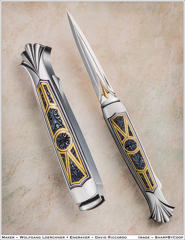 Нож складной от Wolfgang Loerchner. Гравировка от David Riccardo. Гравировка. Растительный орнамент. Всечка золотом. Чернение.