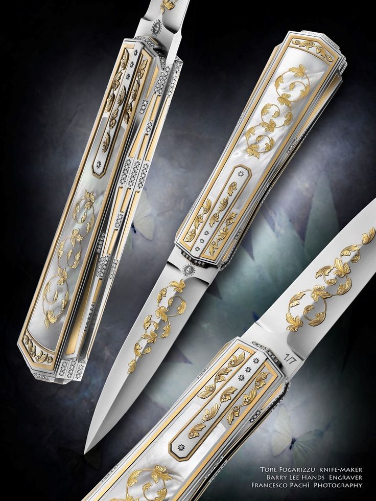 Нож складной от Tore Fogarizzu. Гравировка от Barry Lee Hands. Перламутр. Всечка золотом. Растительный орнамент.