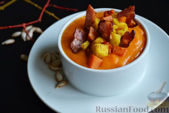 Рецепт: Тыквенный суп-пюре с яблоками и беконом на RussianFood.com
