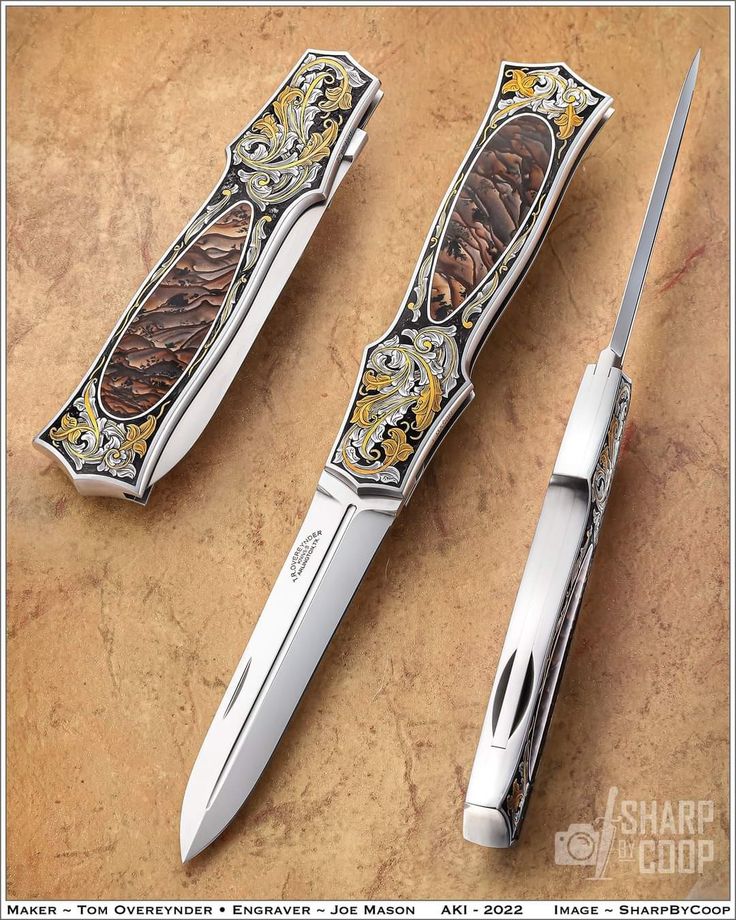 Нож складной от Tom Overeynder. Гравировка от Joe Mason. Гравировка. Растительный орнамент. Всечка золотом.
