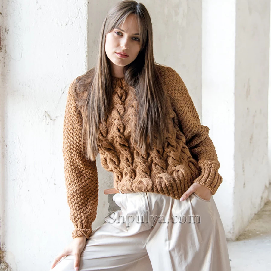 Вертикальные объемные «косы» на переде и спинке песочного вязаного пуловера реглан поистине завораживают.