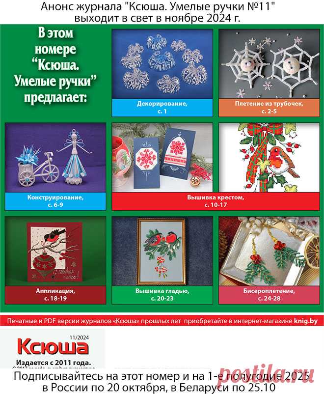 Анонс журнала "Ксюша. Умелые ручки №11" Получить этот номер можно, подписавшись в России по 20.10.2024 и в Беларуси по 25 октября 2024 г. Полноцветное издание, 32 страницы формата А4.