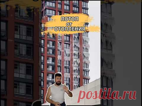 На изображении показано современное многоэтажное здание с красным фасадом и большими окнами, на котором образовался потоп из-за отопления. Внизу расположен человек с выражением указания пальцем. В верхней части изображения размещен текст: "ПОТОП ОТ ОТОПЛЕНИЯ".