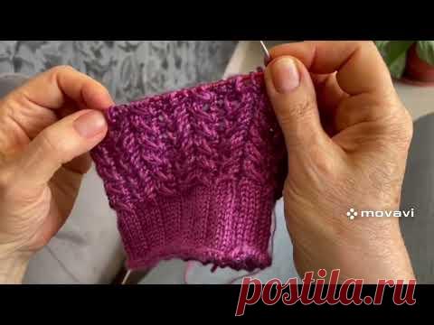 Изображение рук, держащих кусок вязания пурпурного цвета с узором.