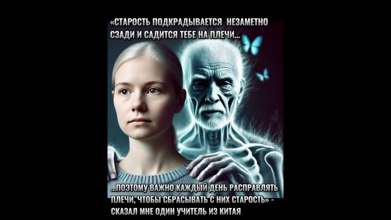 Изображение молодой женщины с образной старухой на заднем плане, символизирующей старение. Текст на изображении говорит о том, что старость подкрадывается незаметно и садится на плечи, и важно ежедневно расправлять плечи, чтобы сбрасывать старость.