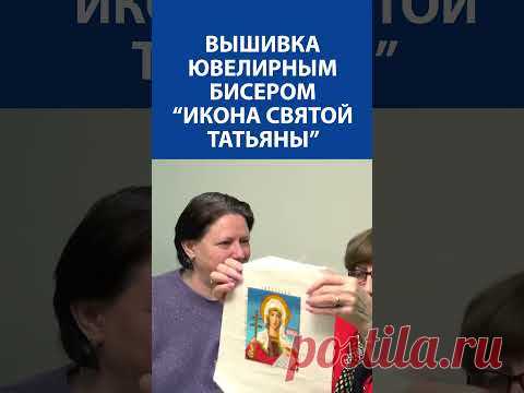 Изображение показывает двух женщин, держащих вышитую икону Святой Татьяны с использованием ювелирного бисера. На фоне находится текст на русском языке.