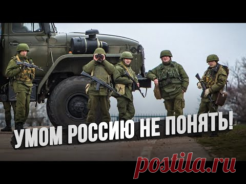 Изображение показывает пятерых военных в зелёной униформе, которые стоят рядом с военным грузовиком. На изображении также присутствует текст: "Умом Россию не понять!".
