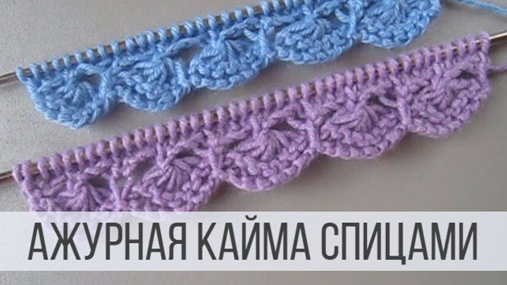Изображение показывает два вязаных узора на спицах в голубом и сиреневом цветах. Подпись на изображении гласит "Ажурная кайма спицами".