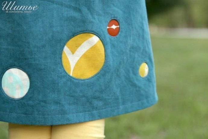 Изображение показывает часть синей одежды с яркими круглыми нашивками разного цвета.