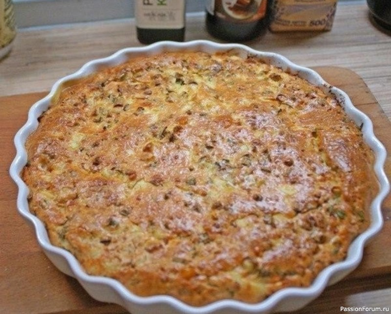 На изображении пирог, приготовленный в круглой форме для выпечки. Его поверхность золотисто-коричневая с видимой текстурой.