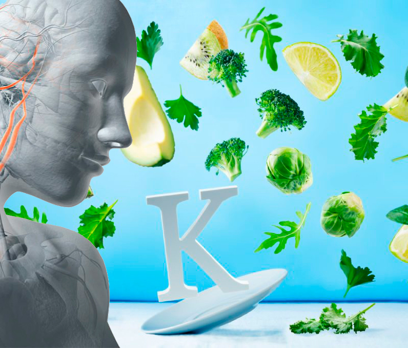 На изображении показан серый силуэт человеческого тела на синем фоне, вокруг которого парят различные зеленые овощи и фрукты, такие как брокколи, авокадо, лимон и киви. В центре изображения находится большая белая буква "К".