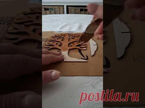 На изображении показан процесс работы с деревянной вырезкой в форме дерева.