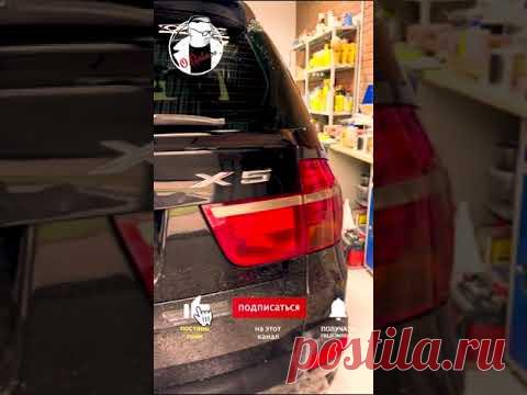 Изображение задней части черного автомобиля BMW X5, стоящего в гараже или мастерской. На заднем стекле наклейка с изображением персонажа. Внизу экран с надписями, приглашающими подписаться.