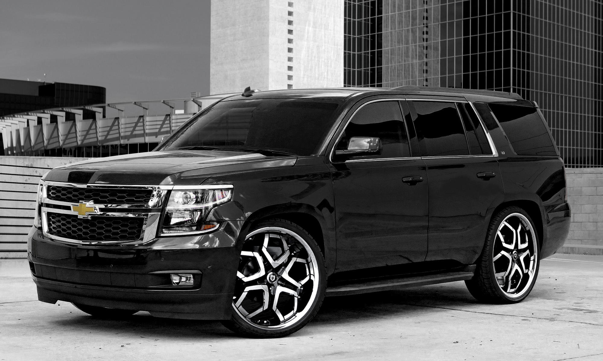 Изображение черного внедорожника Chevrolet на фоне городской архитектуры.