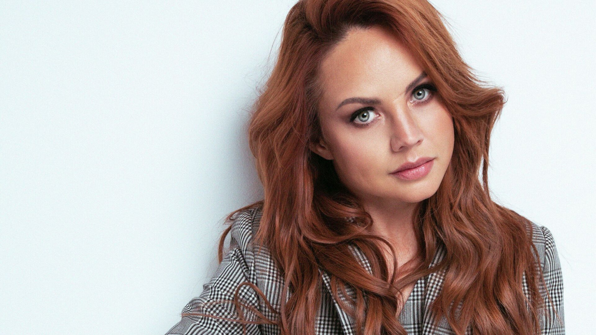 Женщина с длинными рыжими волосами и в клетчатом пиджаке смотрит в камеру.