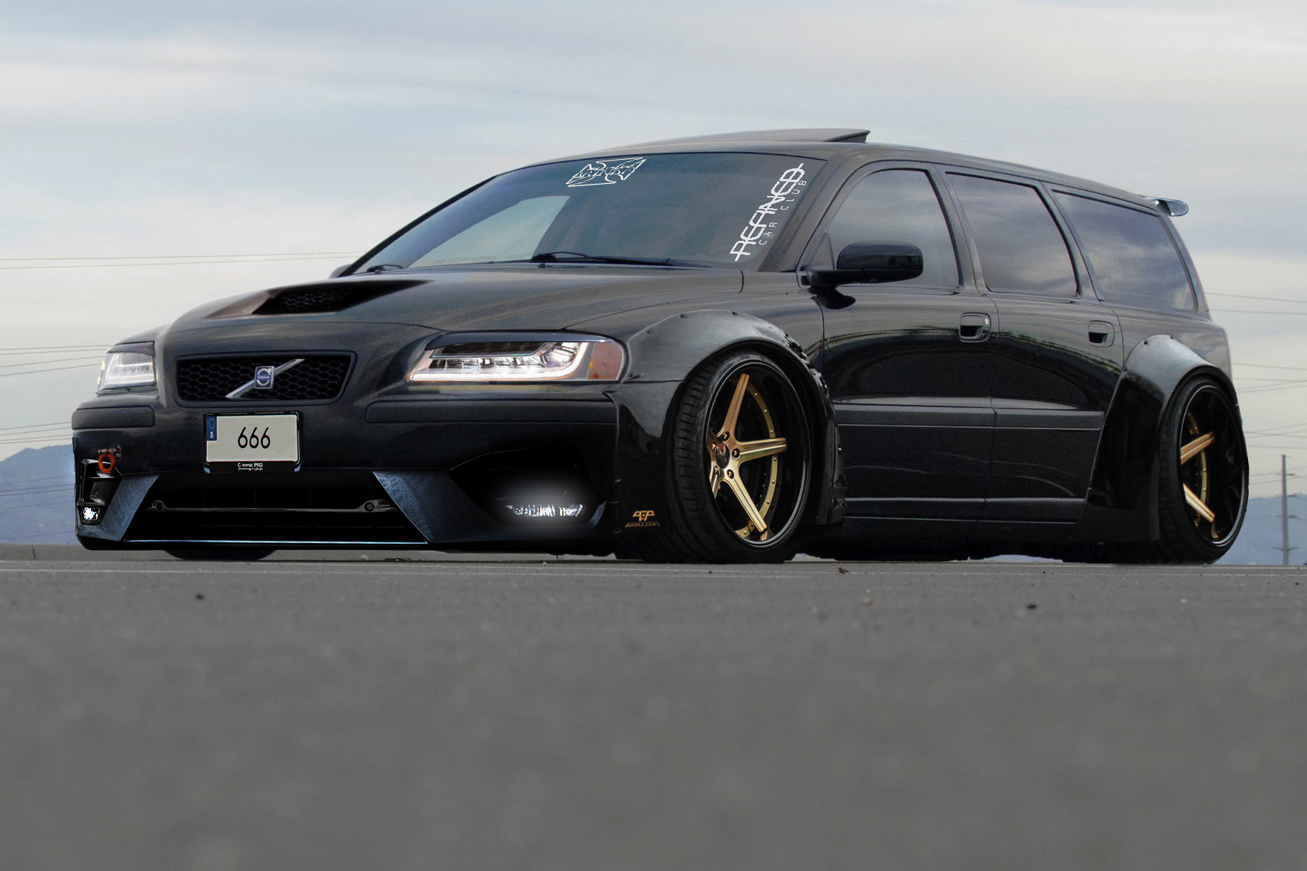 Модифицированный автомобиль Volvo с заниженной подвеской и золотыми колесами, снят на фоне неба.