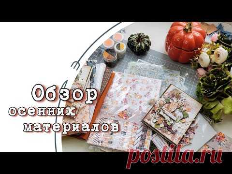 На изображении показан обзор осенних материалов для рукоделия. На столе расположены различные украшения, в том числе тыквы, цветы, альбомы и наборы бумаги с осенними узорами.
