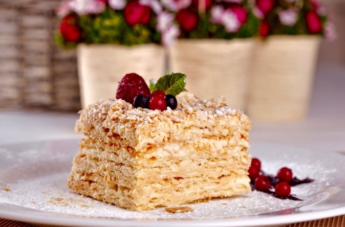 На изображении кусок торта "Наполеон", украшенный свежими ягодами и мятой. Торт подан на белой тарелке, на заднем плане видны цветочные горшки.