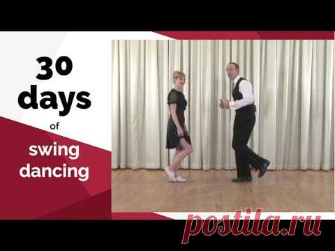 Изображение показывает пару, танцующую в зале для занятий, с надписью "30 days of swing dancing".