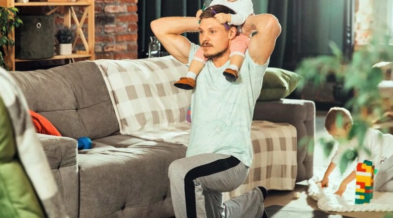 Мужчина занимается с ребёнком на плечах в домашней обстановке. Ещё один ребёнок играет рядом.