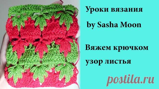 Изображение с примером вязания крючком листового узора в красно-зеленых цветах. Текст гласит: "Уроки вязания by Sasha Moon. Вяжем крючком узор листья."