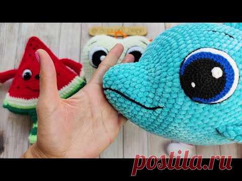 Изображение показывает вязаные игрушки, включая синего дельфина и арбуз, удерживаемые рукой.