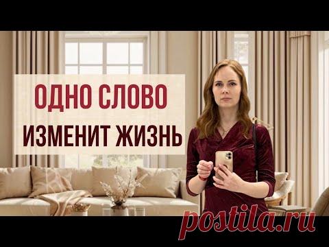 На изображении женщина стоит в комнате с современным интерьером. На фоне присутствует текст «Одно слово изменит жизнь».