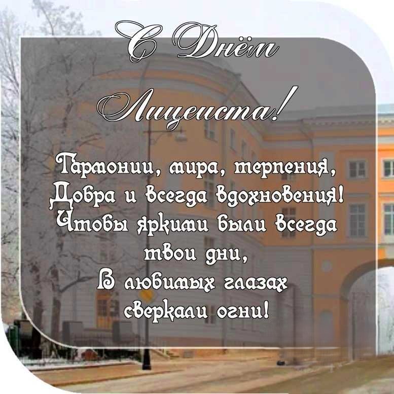 Открытка с поздравлением с Днём лицеиста. Фон изображает здание, украшенное деревьями. Текст на открытке желает гармонии, мира, терпения и вдохновения.