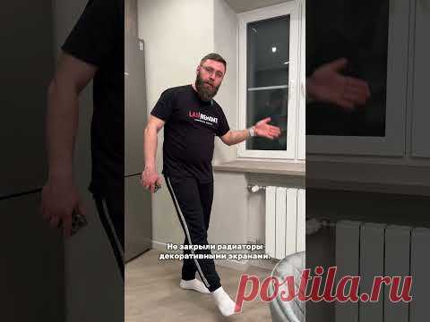 На изображении мужчина в черной футболке и спортивных штанах стоит в комнате рядом с окном и радиатором отопления. Он показывает рукой на радиатор. На экране есть текст на тему отопления.