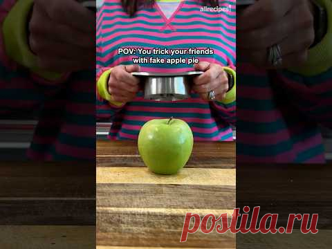 Изображение показывает человека, держащего металлическую форму над зелёным яблоком. На изображении присутствует текст: "POV: You trick your friends with fake apple pie."