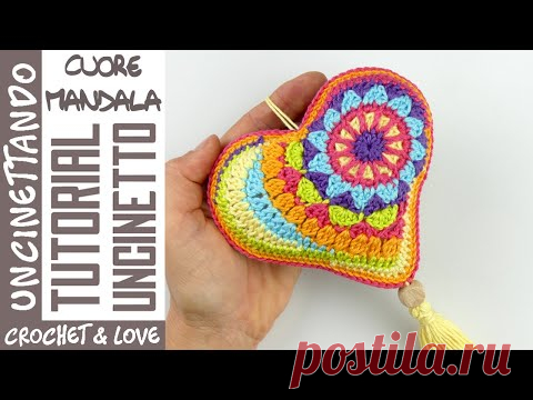 Изображение показывает вязаное крючком сердце с ярким узором мандалы. Его держат в руке. Текст на изображении содержит слова "CUORE MANDALA", "TUTORIAL UNCINETTO", и "CROCHET & LOVE".