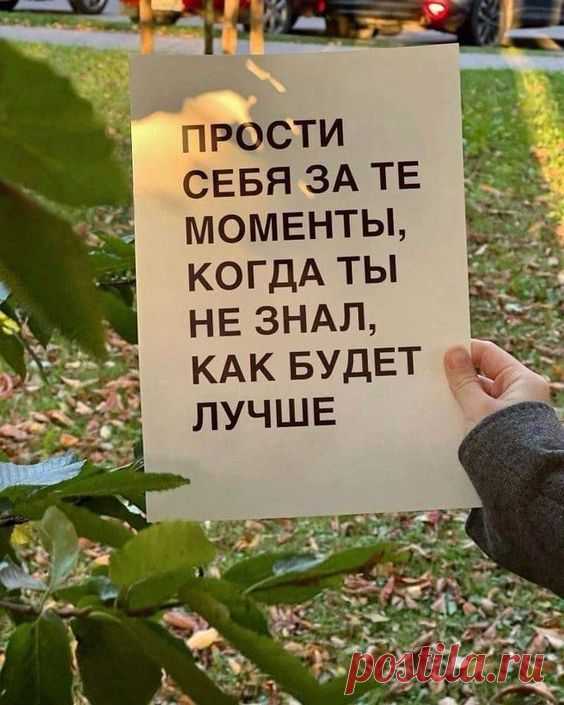 Фотография показывает руку, держащую бумагу с надписью: "Прости себя за те моменты, когда ты не знал, как будет лучше". На заднем плане виден зеленый пейзаж с листьями и травой.